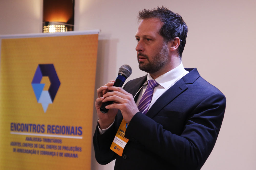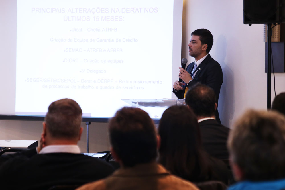 O Analista-Tributário Fernando Assini, que é chefe da Divisão de Controle e Acompanhamento Tributário (Dicat) da Delegacia da Receita Federal do Brasil de Administração Tributária (Derat) em São Paulo, apresentou as mudanças realizadas na unidade e ressaltou a importância do trabalho dos Analistas-Tributários nas atividades de cobrança realizadas pela RFB. Nos últimos meses, segundo o Analista-Tributário Fernando Assini, a Derat passou por diversas reformulações, como a nomeação de Analistas-Tributários para chefia, a criação da Equipe especializada em Garantia de Crédito e em outros setores e pelo redimensionamento de processos de trabalho e do quadro de servidores. “Foram mudanças que aumentaram a efetividade da cobrança e a presença fiscal. Foi adotada uma visão integral do passivo tributário, assim como foi criado um grupo de trabalho com atribuições para executar procedimentos especiais. Medidas que otimizam e garantem maior celeridade na cobrança, na seleção de contribuintes, que possibilitam a análise de perfil e a definição de medidas coercitivas aplicáveis. O objetivo da cobrança especial é arrecadar e essa foi a diretriz apresentada”, reforçou.