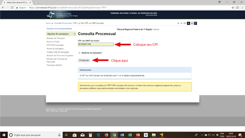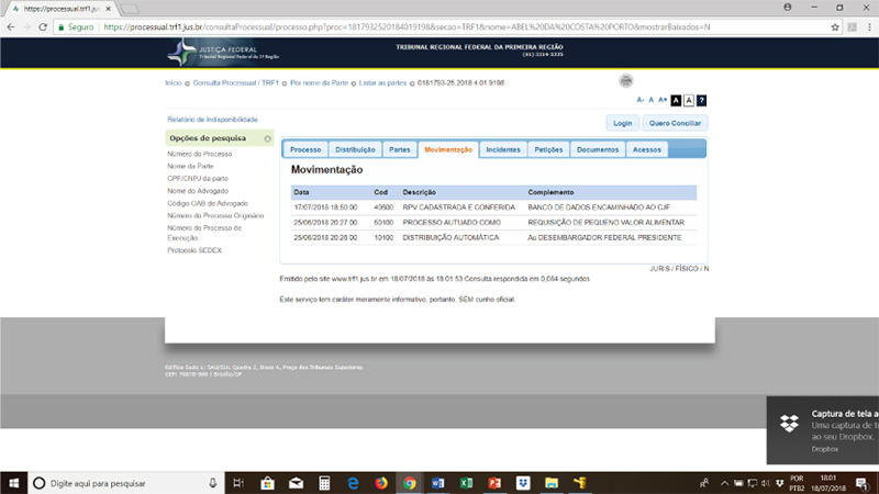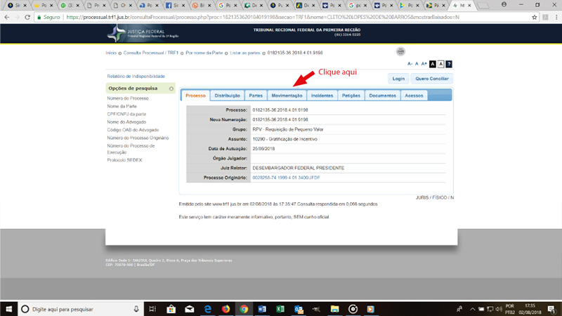 Os contemplados por essa ação da GDAT (aposentados até jun/1999) poderão verificar se estão dentre os 2.199 RPV já depositados, realizando consulta no site do Tribunal Regional da 1ª Região, selecionando o órgão “TRF 1ª Região”, opção de pesquisa “CPF/CNPJ da parte”; veja o caminho: