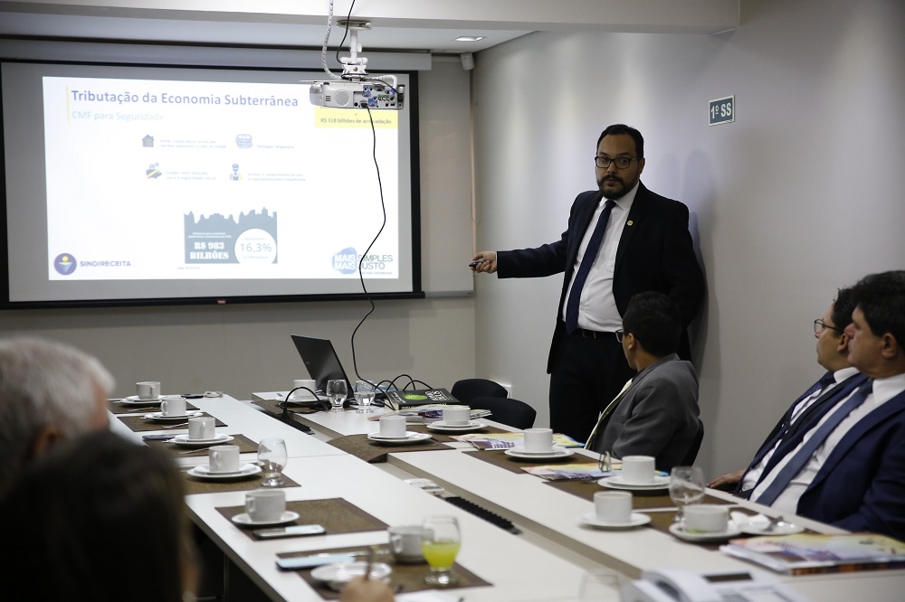 A tributação da economia subterrânea no Brasil possibilitaria a arrecadação de mais de R$ 3 trilhões em 10 anos, sem prejuízos para a Seguridade Social, para as aposentadorias e para a geração de emprego e renda no País. Essa é a ideia central do projeto “Mais Simples Mais Justo”, desenvolvido pelo Grupo de Estudos Tributários do Sindireceita. A iniciativa foi apresentada a parlamentares e assessores na manhã desta terça-feira, dia 7, pelo diretor de Estudos Técnicos do Sindicato, Eduardo Schettino, em reunião ocorrida na sede da Diretoria Executiva Nacional (DEN), em Brasília/DF.