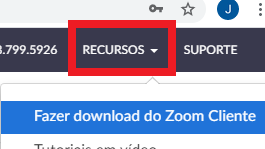 Clicar em Recursos (ou Resources se estiver em inglês) no menu superior direito e escolher a opção “Fazer download do Zoom Cliente”