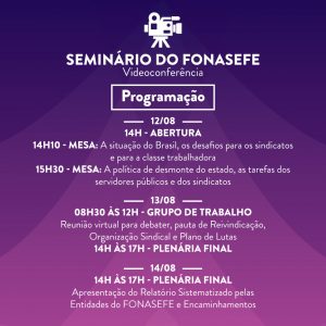 O Sindireceita convida os Analistas-Tributários em todo o Brasil a participarem, nos dias 12, 13 e 14 de agosto, do seminário em defesa dos serviços públicos e do Estado democrático promovido pelo Fonasefe. O evento estava programado para acontecer entre os dias 05 a 07, mas foi adiado para a próxima semana. O seminário será realizado por videoconferência e contará com a participação de dirigentes sindicais das entidades do setor público do Fonasefe.