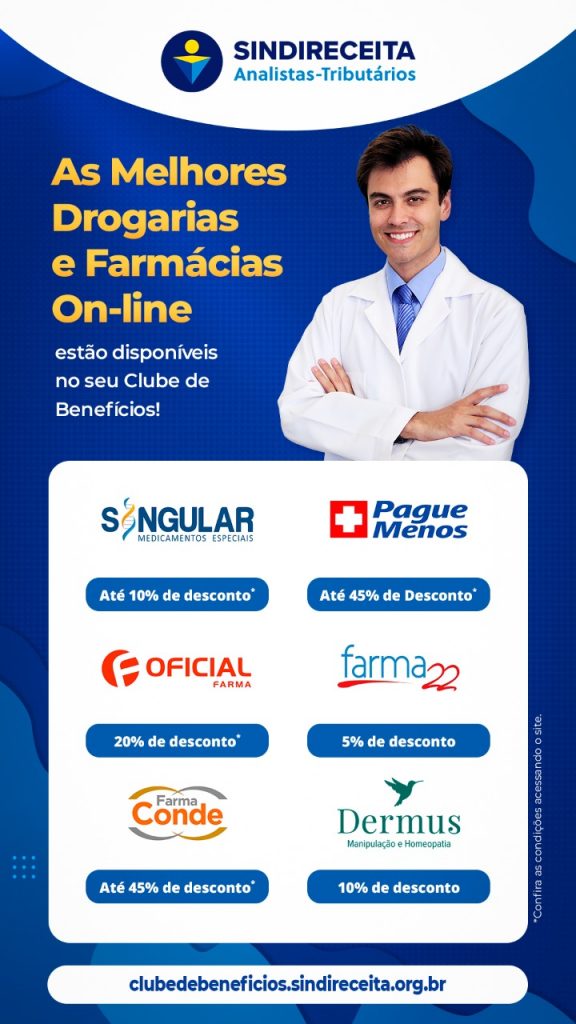 O Clube de Benefícios do Sindireceita conta com mais uma vantagem exclusiva para os filiados em todo o Brasil: desconto em medicamentos em farmácias e drogarias on-line. Os descontos variam de 10 % a 45% para os filiados ao Sindireceita.