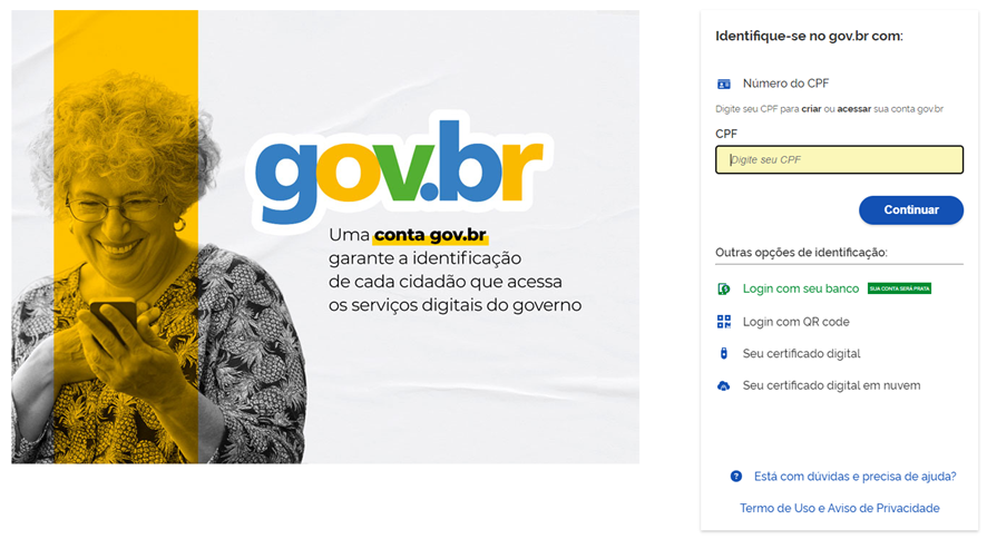 - Para ter acesso ao aplicativo o interessado deve informar seu CPF e a sua senha. Caso não possua cadastro no gov.br acesse >> Criar sua conta gov.br