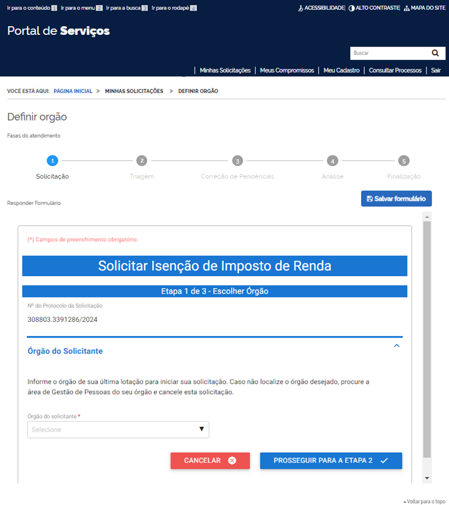 - Ao acessar o gov.br você estará na página Portal de Serviços, na qual deverá cumprir três etapas para finalizar sua solicitação de isenção de Imposto de Renda