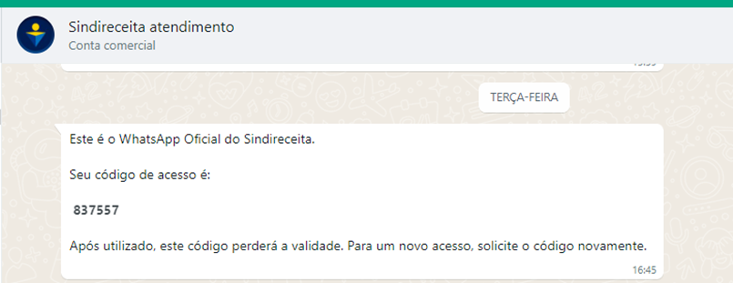 Pelo WHATSAPP você receberá o código da seguinte forma:
