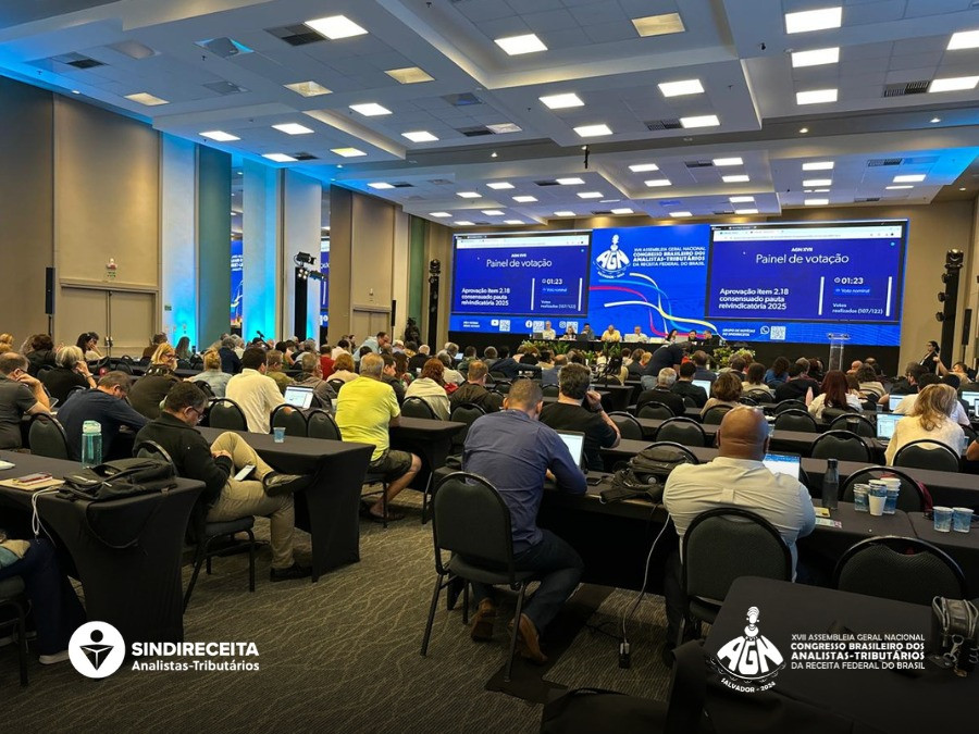 A Plenária da XVII Assembleia Geral Nacional (AGN) Ordinária/Congresso Brasileiro dos Analistas-Tributários da Receita Federal do Brasil aprovou, na manhã desta sexta-feira, dia 6, o texto base, sem destaques, da Pauta Reivindicatória da categoria para o ano de 2025. O evento segue até a noite de hoje, em Salvador/BA.