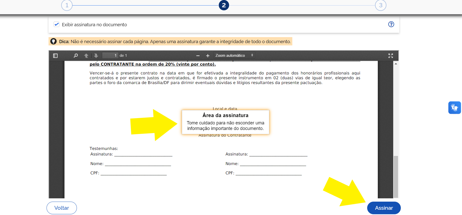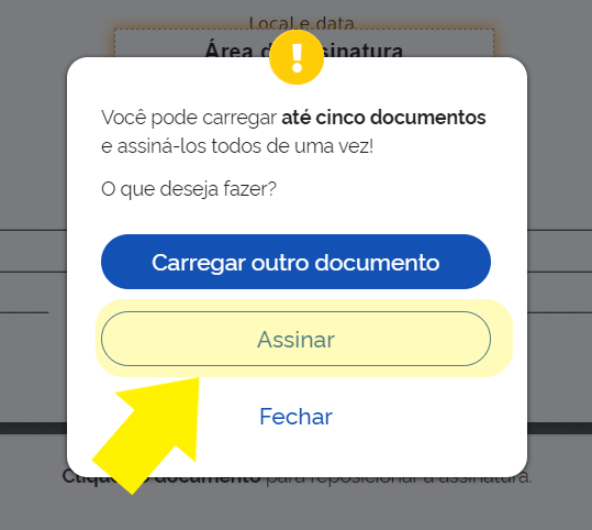 Escolha o local onde sua assinatura eletrônica será registrada no documento e clique em ASSINAR