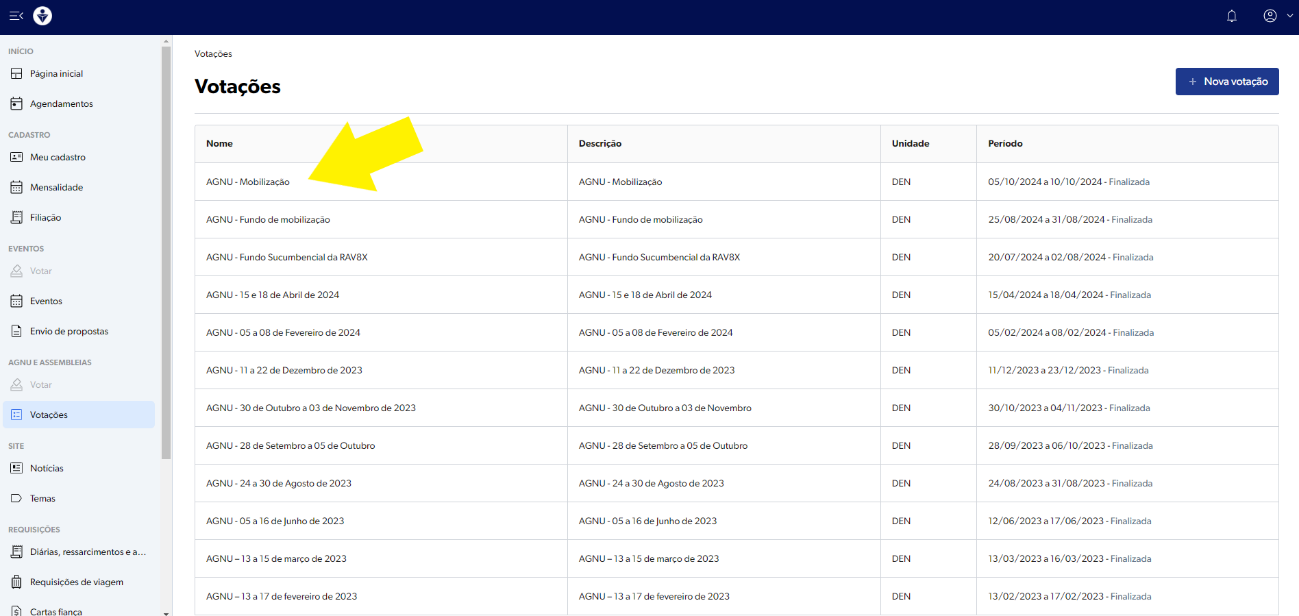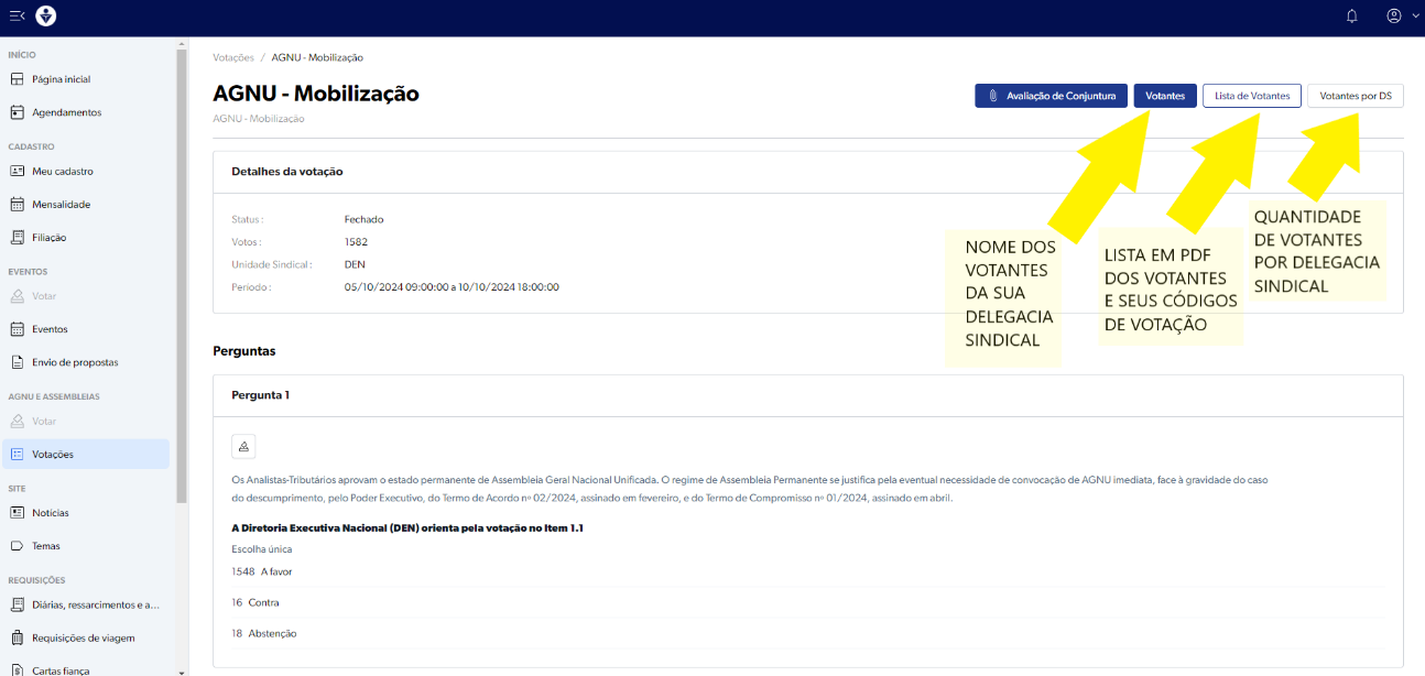 Pronto! Agora você pode conferir os resultados das votações, geral e por Indicativo. Além disso, nos botões “VOTANTES”, “LISTA DE VOTANTES” e “VOTANTES POR DS” você terá mais detalhes da votação da AGNU.