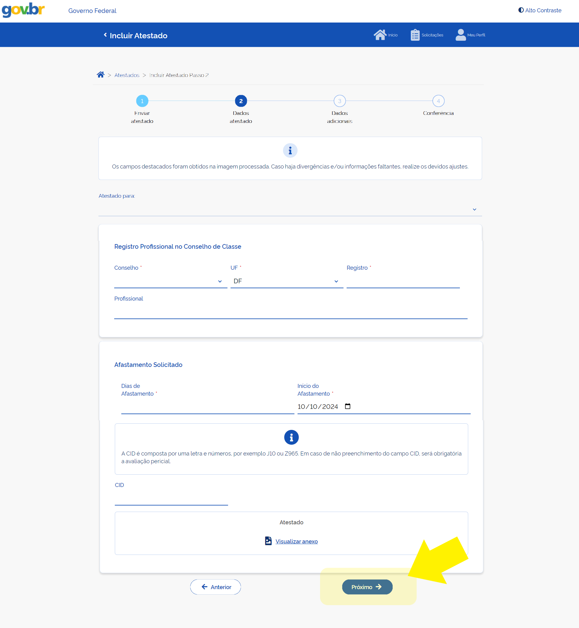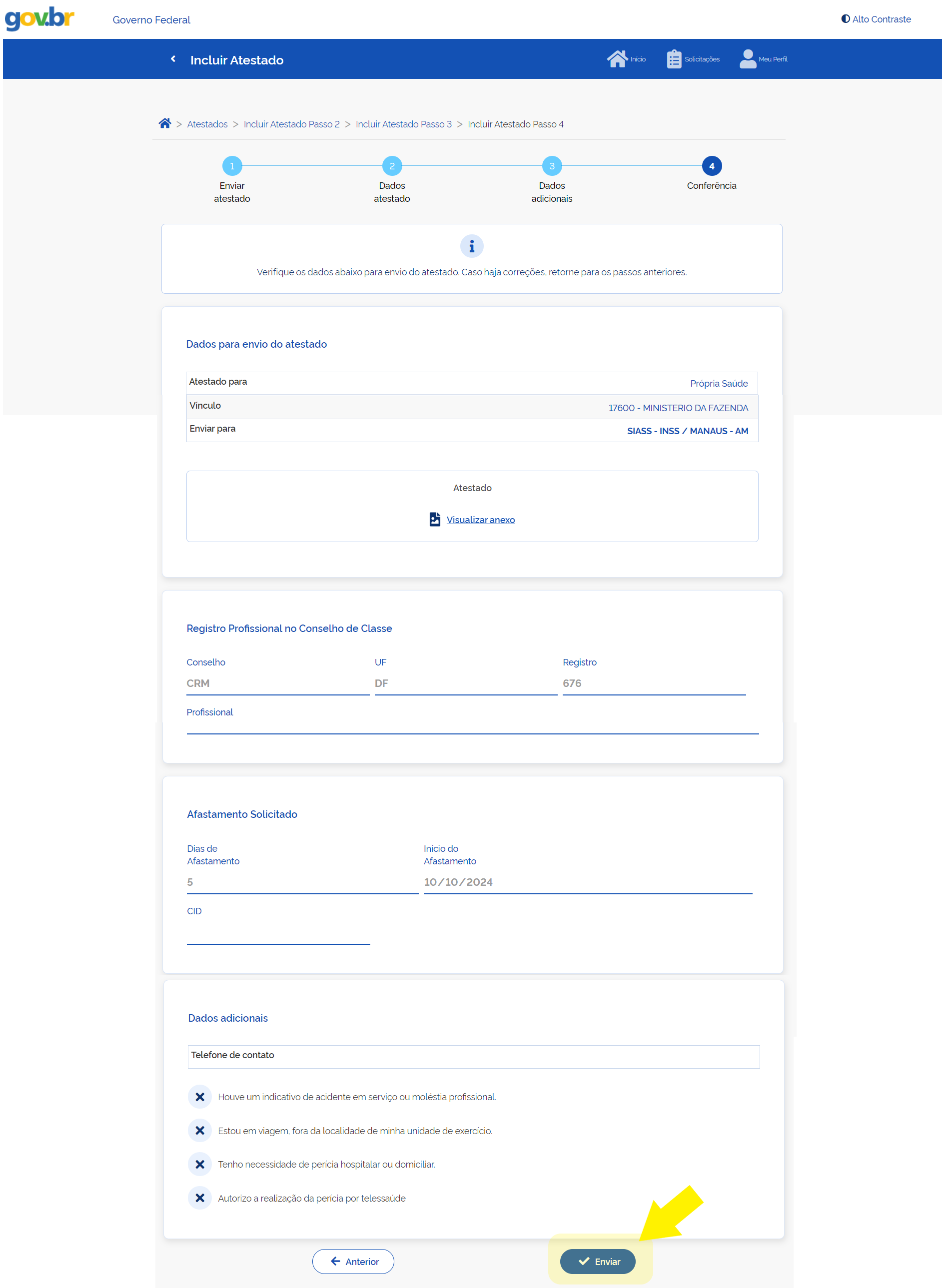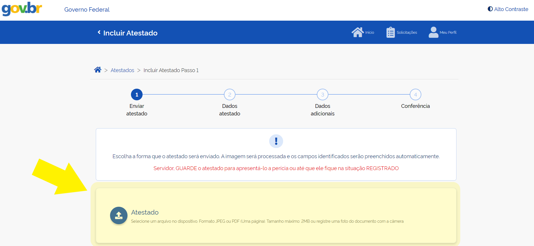 Apresentação de atestado, emitido por médico ou cirurgião-dentista, com sugestão de dias de afastamento, para fins de registro no módulo de afastamento e, quando necessário, agendamento de perícia médica.