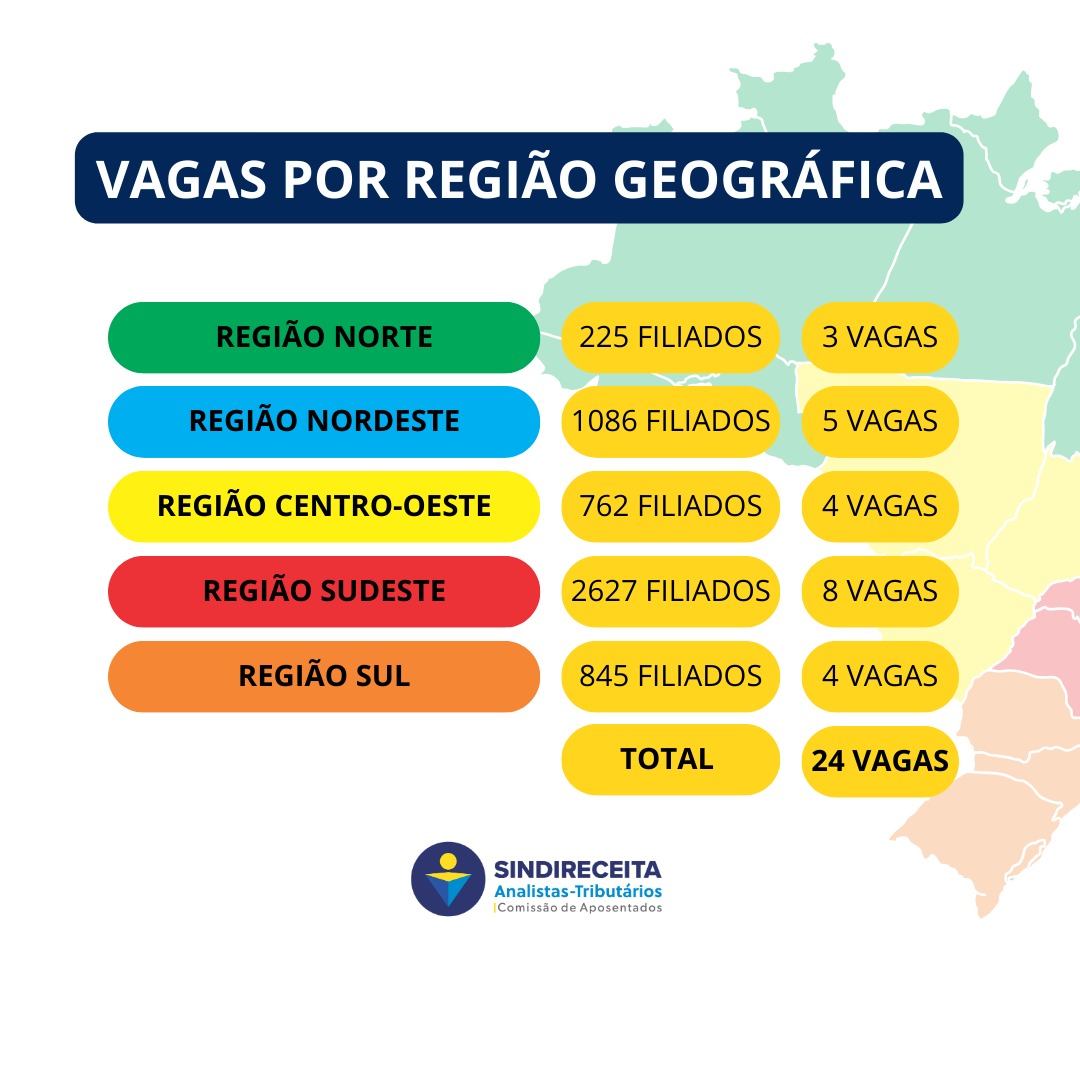A Comissão será constituída somente por Analistas-Tributários e Analistas-Tributárias aposentados(as), devidamente filiados(as) ao Sindireceita. Conforme previsto no Art. 2º da Resolução acima mencionada, durante a primeira gestão trienal, o Colegiado deverá ser composto por, no máximo, 24 integrantes distribuídos por Regiões Geográficas, com o seguinte número máximo de vagas: 3 (Norte); 5 (Nordeste); 4 (Centro-Oeste); 8 (Sudeste); e 4 (Sul).