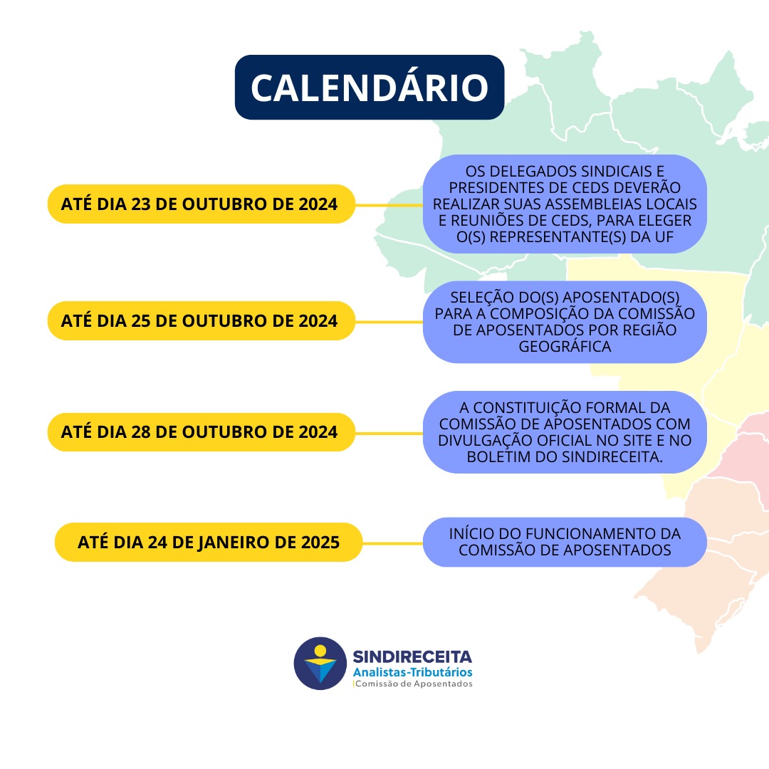 Os delegados(as) sindicais e presidentes dos CEDS deverão realizar suas Assembleias Locais e Reuniões de CEDS, respectivamente, até o dia 23 de outubro de 2024, para eleger os aposentados representantes das UF.