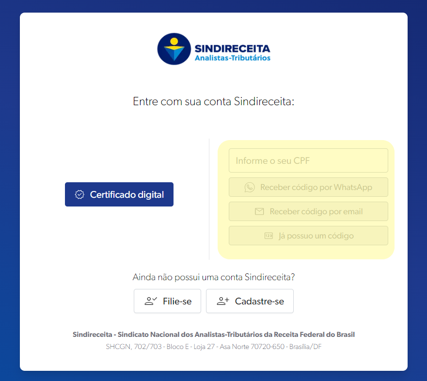 O acesso à Área restrita só é permitido para filiados e filiadas do Sindireceita, que receberão um código para ingresso, que será enviado por whatsapp ou e-mail, conforme a escolha do filiados ou filiada.