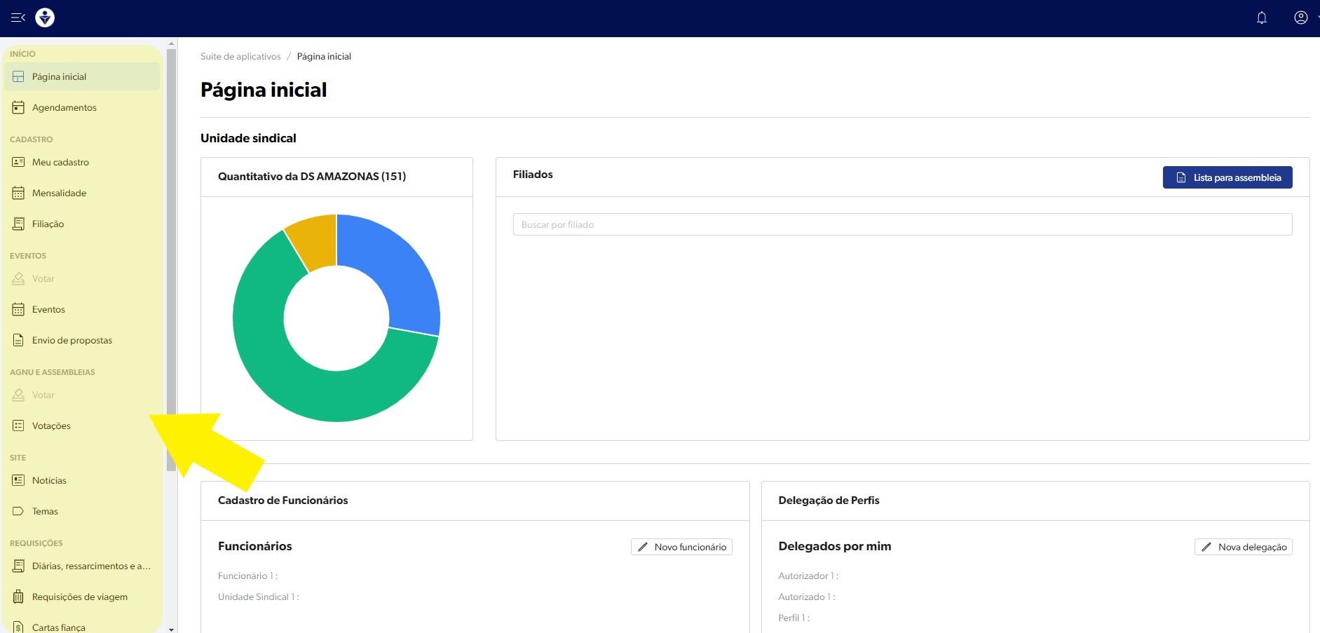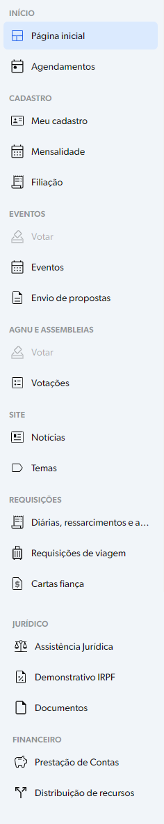Ao entrar na página inicial da Área restrita o filiado ou filiada terá disponível um menu no lado esquerdo, com todas as opções disponibilizadas.