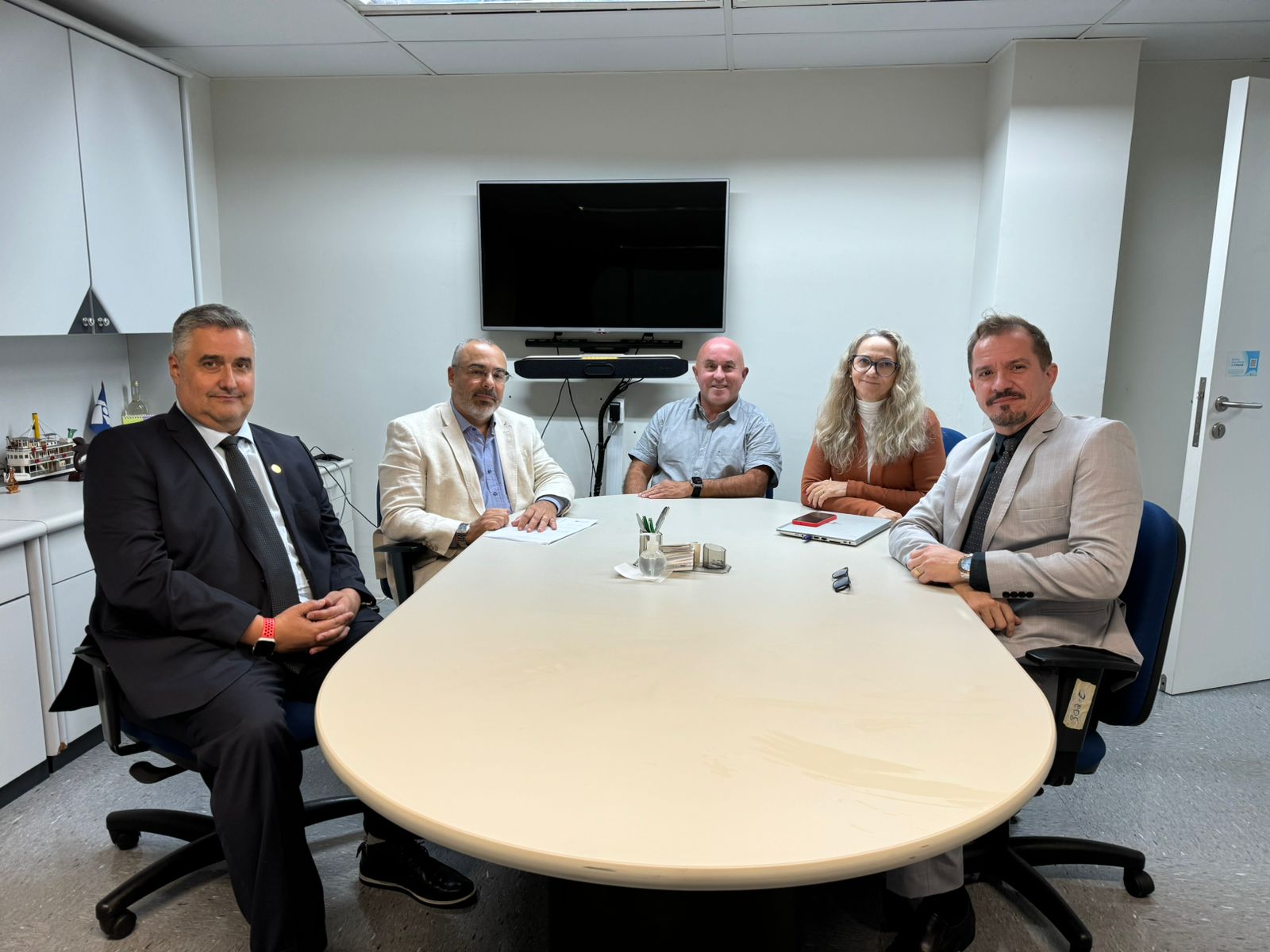 O presidente do Sindireceita, Thales Freitas, o diretor de Defesa Profissional, Alexandre Magno, e o diretor de Estudos Técnicos, Fabiano Rebelo, participaram de reunião na tarde desta quinta-feira, 17, com o coordenador-geral de Gestão de Pessoas (Cogep) da Subsecretaria de Gestão Corporativa da Secretaria Especial da Receita Federal do Brasil (RFB), Marcelo Nascimento Araújo, e a chefe da Divisão de Planejamento de Gestão de Pessoas (Dipla/COGEP), analista-tributária Sandra Aparecida de Souza Pereira.