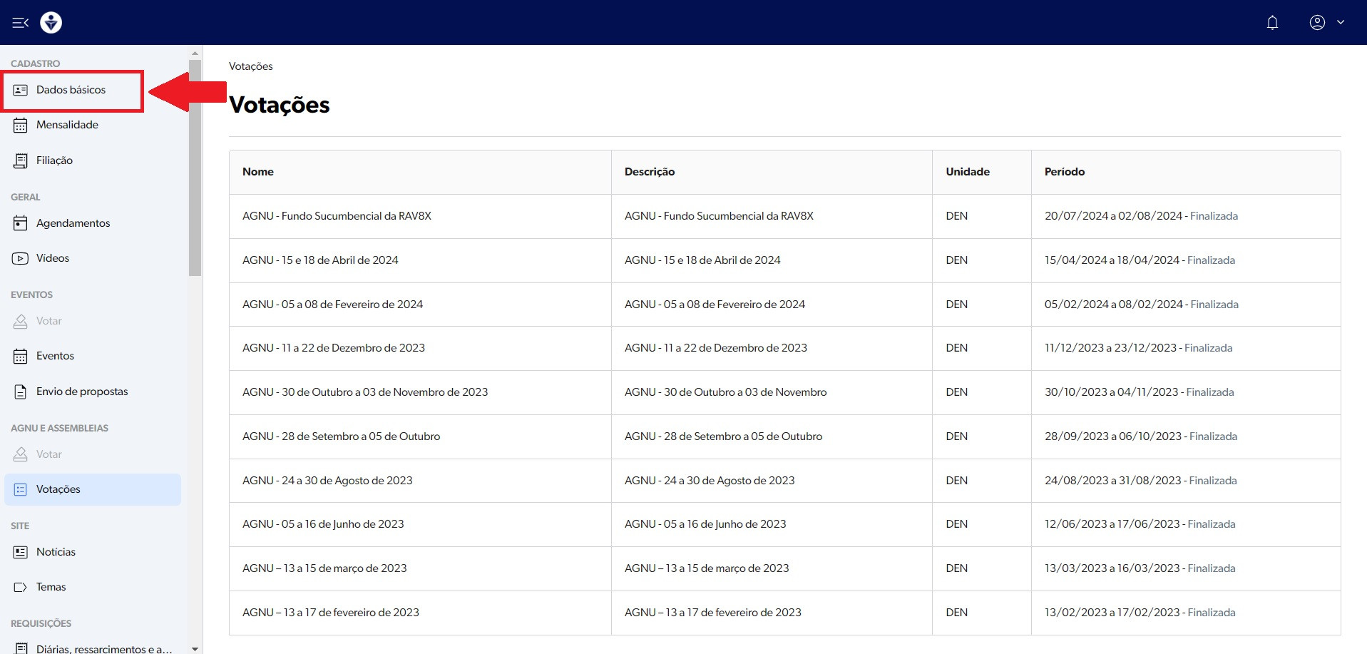 Após acessar a Suíte de Aplicativos, clique na opção “Dados Básicos”, presente na parte superior do lado esquerdo da tela.