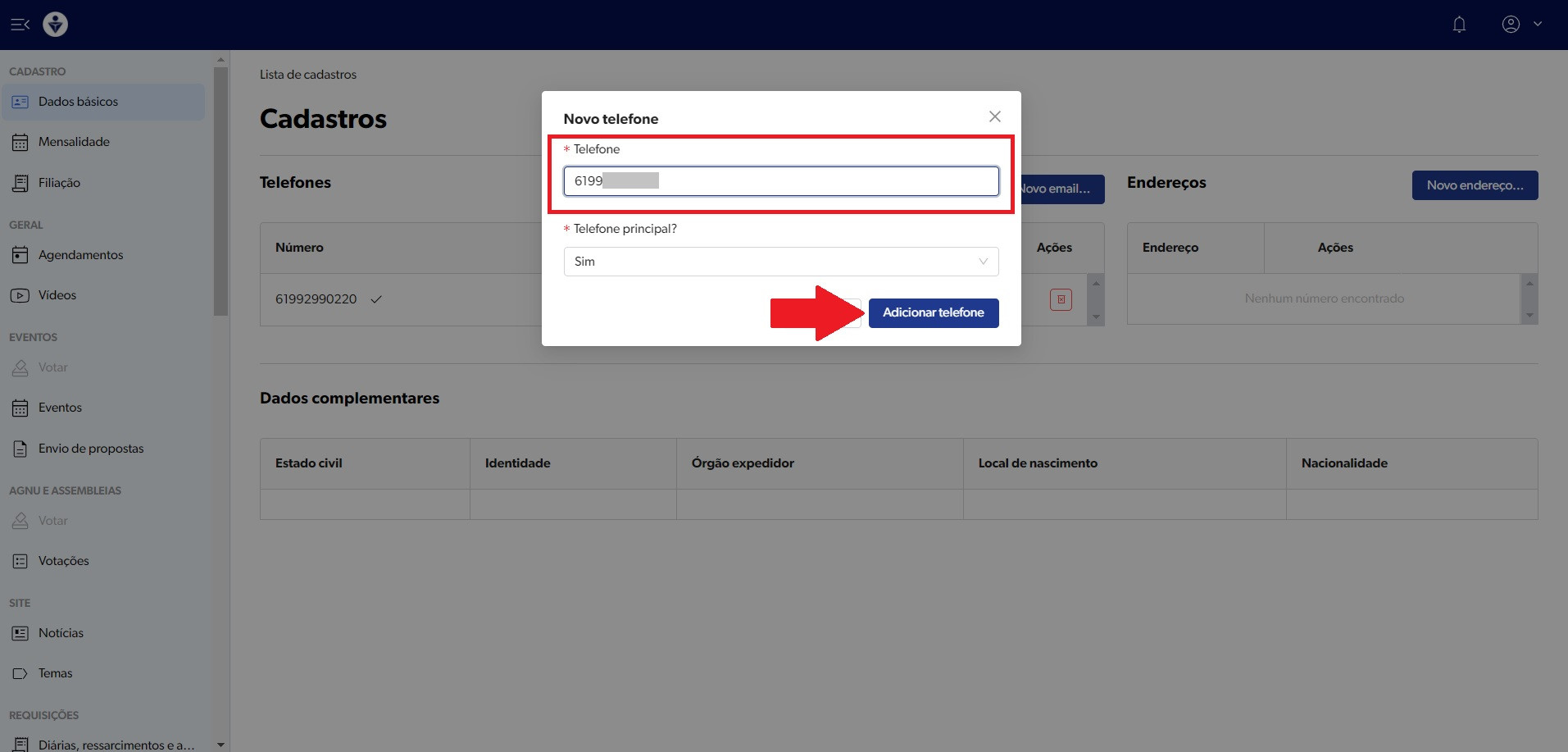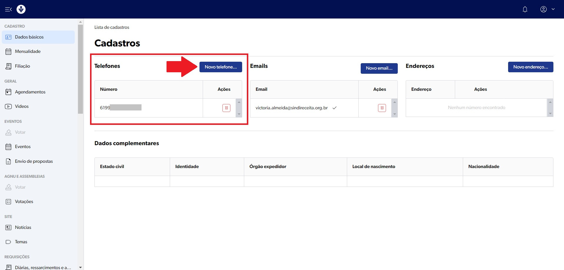 No campo "Cadastros", você poderá atualizar várias informações, como telefone, e-mail, endereço, dados complementares e a localização física atual. Caso você verifique que o seu número de celular presente na opção “Telefones” não é o mesmo que você utilizou para solicitar a entrada no Grupo de Notícias do Sindireceita no WhatsApp, basta alterar essa informação, clicando em “Novo Telefone”.