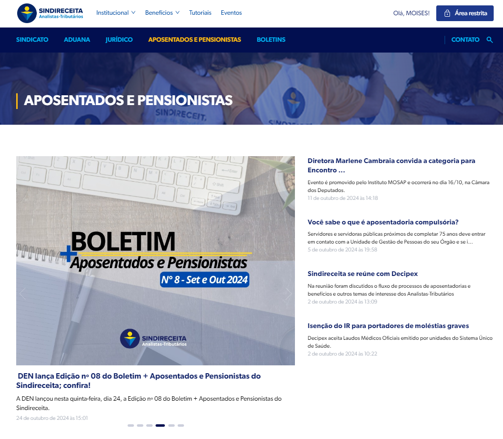 Na primeira parte da página dos Aposentados e Pensionistas você terá acesso as últimas notícias produzidas e divulgadas pela Diretoria de Comunicação do Sindireceita. No chamado “Carrossel de Noticias” você encontrará as seis notícias de maior destaque e na lateral direita mais quatro notícias relacionadas pela data de publicação e importância.