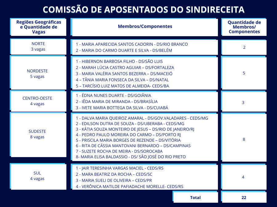 A Comissão é formada por Analistas-Tributários e Analistas-Tributárias aposentados(as), devidamente filiados(as). Foram eleitos 22 integrantes distribuídos por Regiões Geográficas: 2 (Norte); 5 (Nordeste); 3 (Centro-Oeste); 8 (Sudeste) e 4 (Sul).