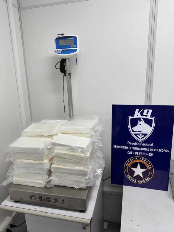 No dia 4 de dezembro, a Receita Federal interceptou mais de 42 kg de cocaína escondidos em uma carga de exportação com destino à Malásia. A apreensão foi realizada durante o trabalho de rotina de vigilância e repressão aduaneira conduzida pela equipe da Alfândega do Aeroporto de Viracopos, em Campinas/SP, com o apoio de um cão farejador.