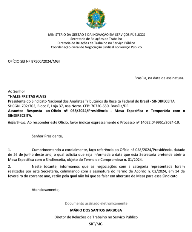 Diante do não atendimento ao postulado no mencionado ofício, o Sindireceita protocolou mais um ofício nº 058/2024 , em 26/06/2024, solicitando que os esclarecimentos referentes à notícia publicada fossem realizados por escrito e que fosse também informada a data que o MGI pretendia abrir a Mesa Específica do Sindireceita, objeto da Cláusula Segunda do Termo de Compromisso 01/2024, firmado em 25/04/2024.