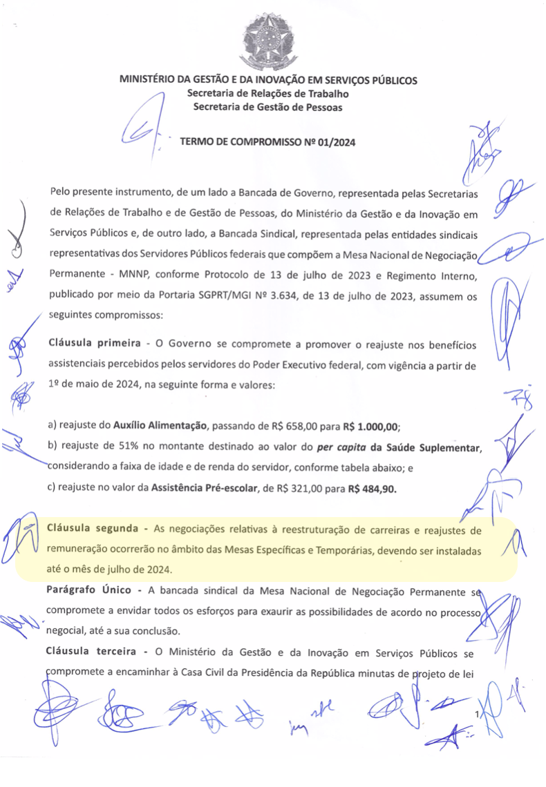 “As negociações relativas à reestruturação de carreiras e reajustes de remuneração ocorrerão no âmbito das Mesas Específicas e Temporárias, devendo ser instaladas até o mês de julho de 2024”.