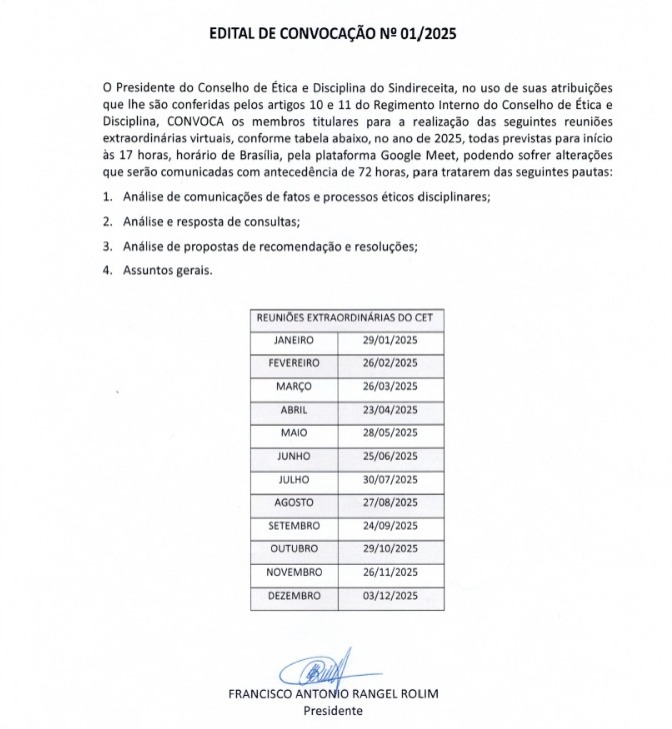 O Conselho de Ética e Disciplina (CET) do Sindireceita divulgou nesta segunda-feira, dia 6, o Edital de Convocação nº 01/2025, contendo convocação do presidente do CET destinada aos membros titulares do colegiado, para a realização de reuniões extraordinárias virtuais, que serão promovidas por meio da plataforma Google Meet. Visando garantir maior participação sindical, o CET destaca que decidiu reunir-se mensalmente, por meio de reuniões extraordinárias virtuais, conforme datas presentes no Edital.