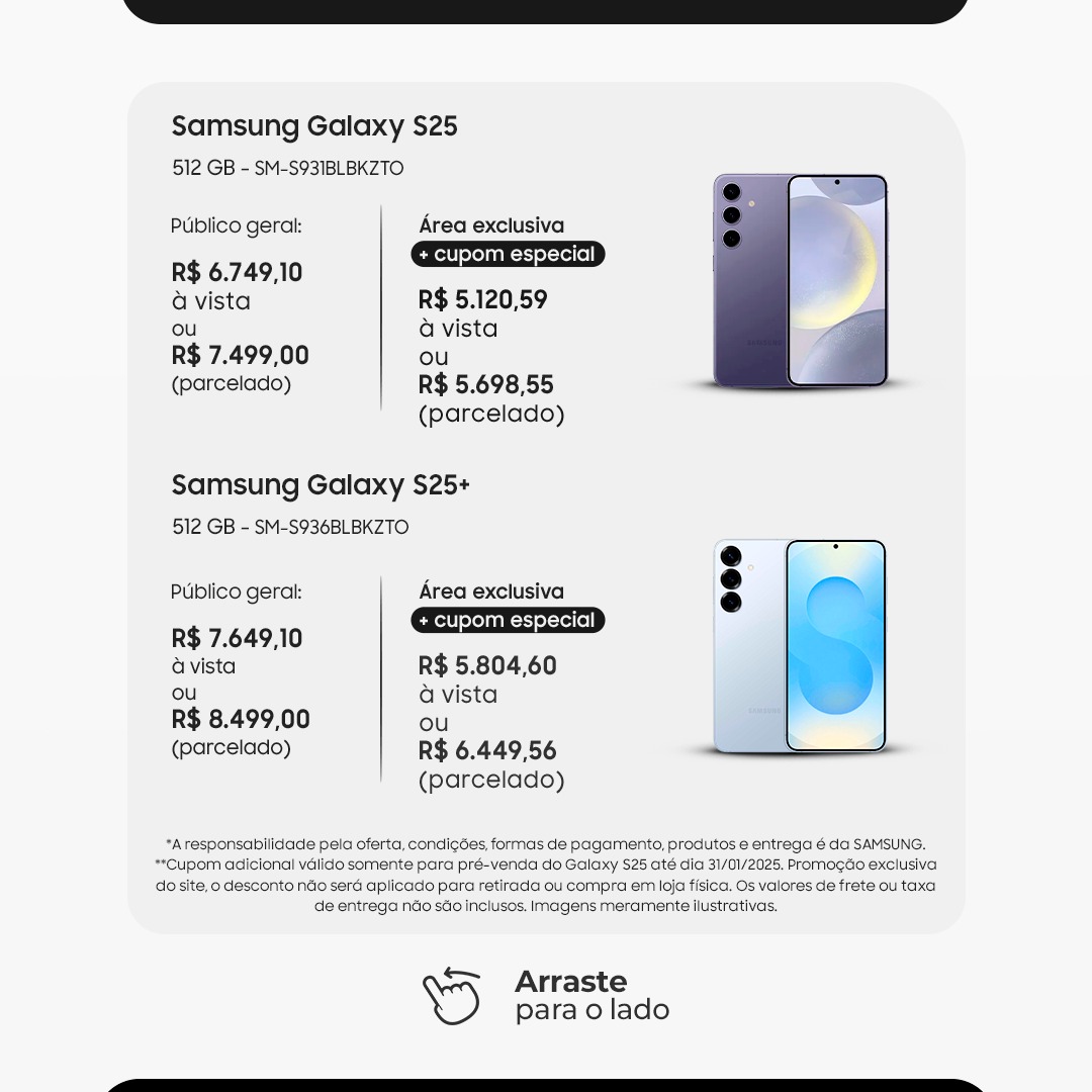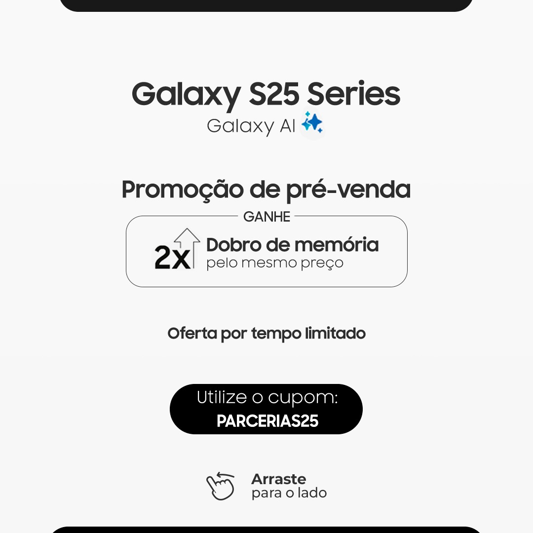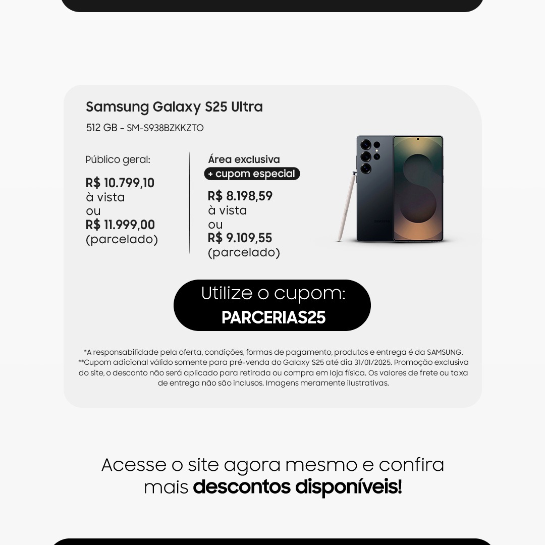 Destacamos que esta oferta é exclusiva do site – o desconto não será aplicado para retirada ou compra em loja física. Os valores de frete ou taxa de entrega não estão inclusos na promoção. Lembramos que a responsabilidade pela oferta, condições, formas de pagamento, produtos e entrega é da Samsung. Utilize o cupom PARCERIAS25 e aproveite!