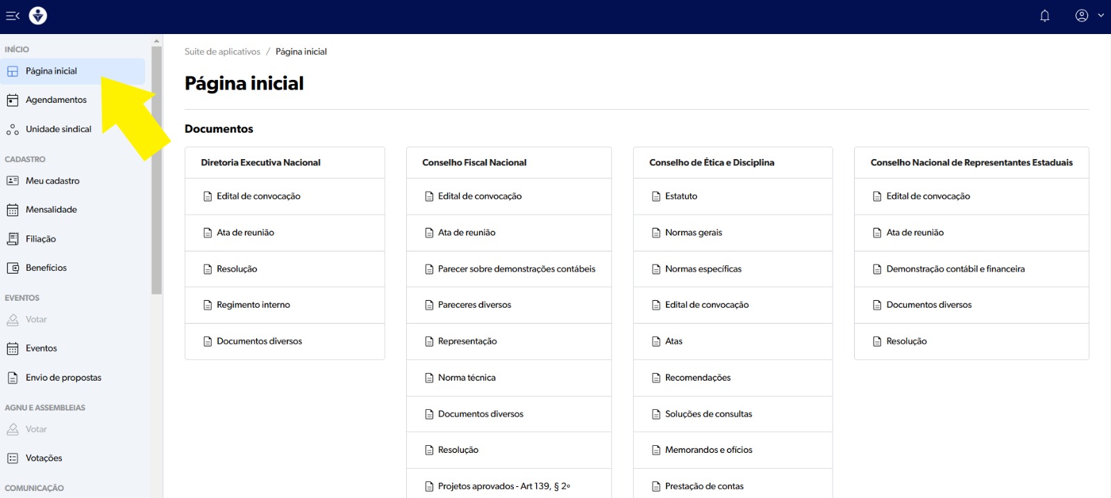 Entre na área restrita do site e, no alto do canto esquerdo clique em Página inicial, conforme a imagem abaixo: