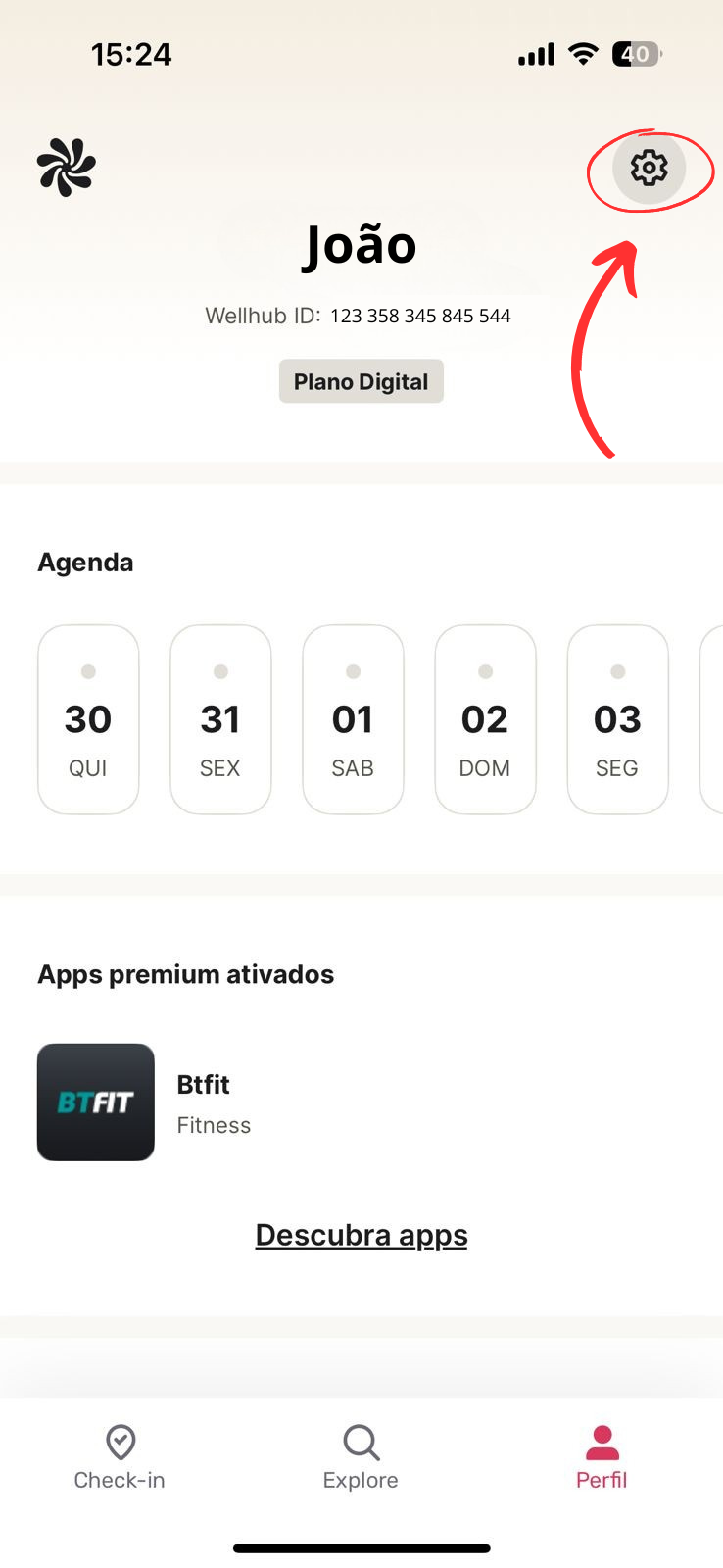 1. Após fazer o login no app, acesse seu perfil e clique no ícone da engrenagem que fica no canto superior direito;