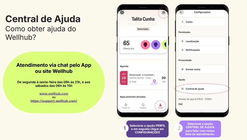 A Central de Ajuda do Wellhub conta com atendimento via chat pelo App ou pelo site (www.wellhub.com ou https://support.wellhub.com/) de segunda à sexta-feira, das 8h as 21h, e aos sábados, das 06h às 15h.