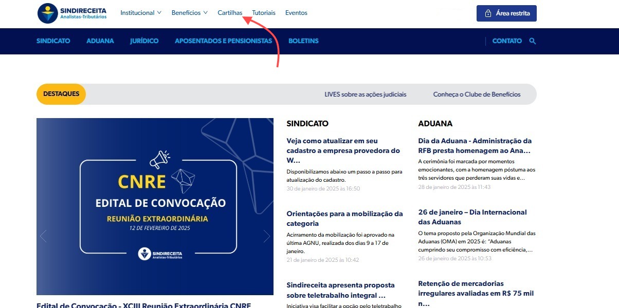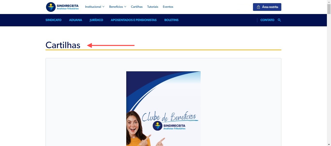 Você poderá acessar o menu “Cartilhas” na página inicial, ao lado do menu Benefícios, no topo da página do Sindireceita. Veja: