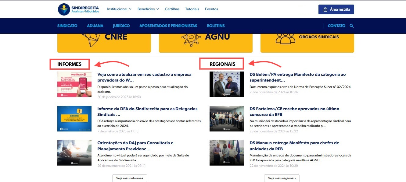 Além disso, foram adicionadas mais duas abas na seção de notícias do site. A primeira, intitulada “Regionais", traz notícias específicas das bases regionais, destacando iniciativas e ações promovidas por delegacias sindicais, conselhos estaduais e conselhos espalhadas pelo país. Já a segunda, chamada "Informes", reúne comunicados oficiais e relevantes emitidos pelo Sindireceita.