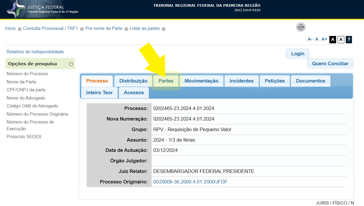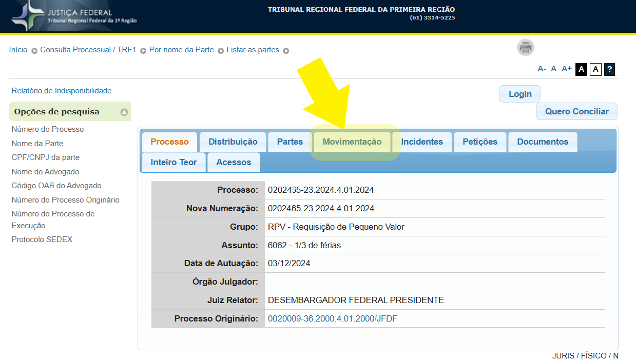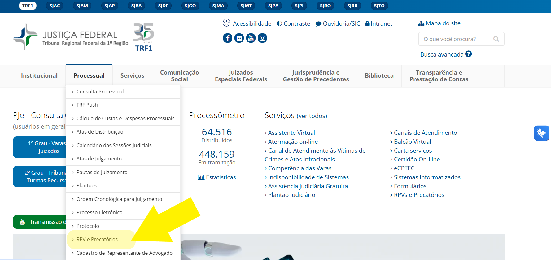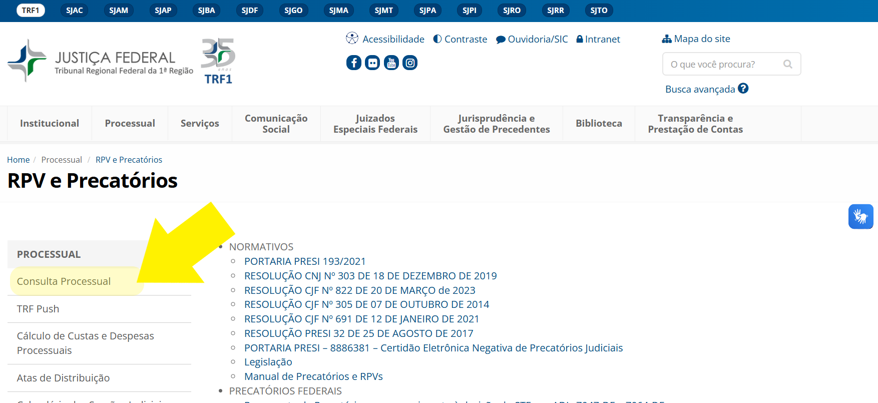 A pesquisa no site do Tribunal ( www.trf1.jus.br ) inicia com um clique na aba Processual e mais um clique na aba “RPV e Precatório”: