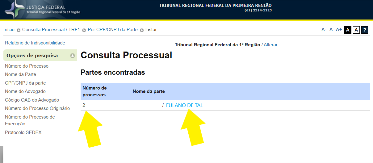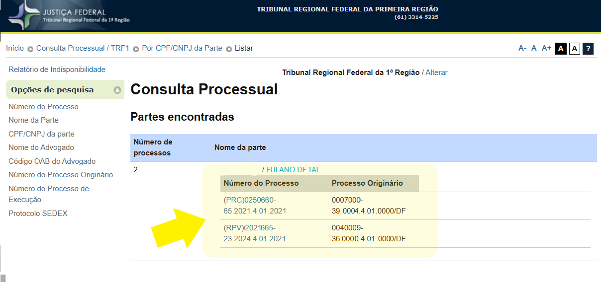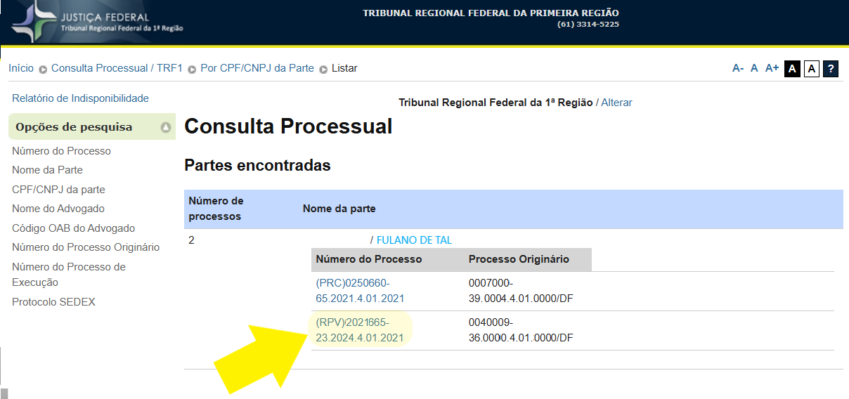 Após clicar em pesquisar, a próxima tela apresentará as informações processuais referentes a precatórios e RPVs vinculados ao CPF pesquisado. Clique no nome para ter detalhes.