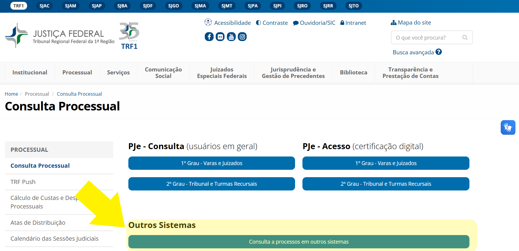Assim, clica-se em “consulta processual” como demonstrado acima e, logo em seguida, e, ‘Outros Sistemas – Consulta de processos em outros sistemas”, como destacado abaixo.