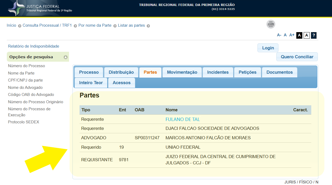 Uma nova tela se abrirá e o filiado poderá clicar CPF da PARTE (como no destaque) e preencher o campo digitando o número de CPF: