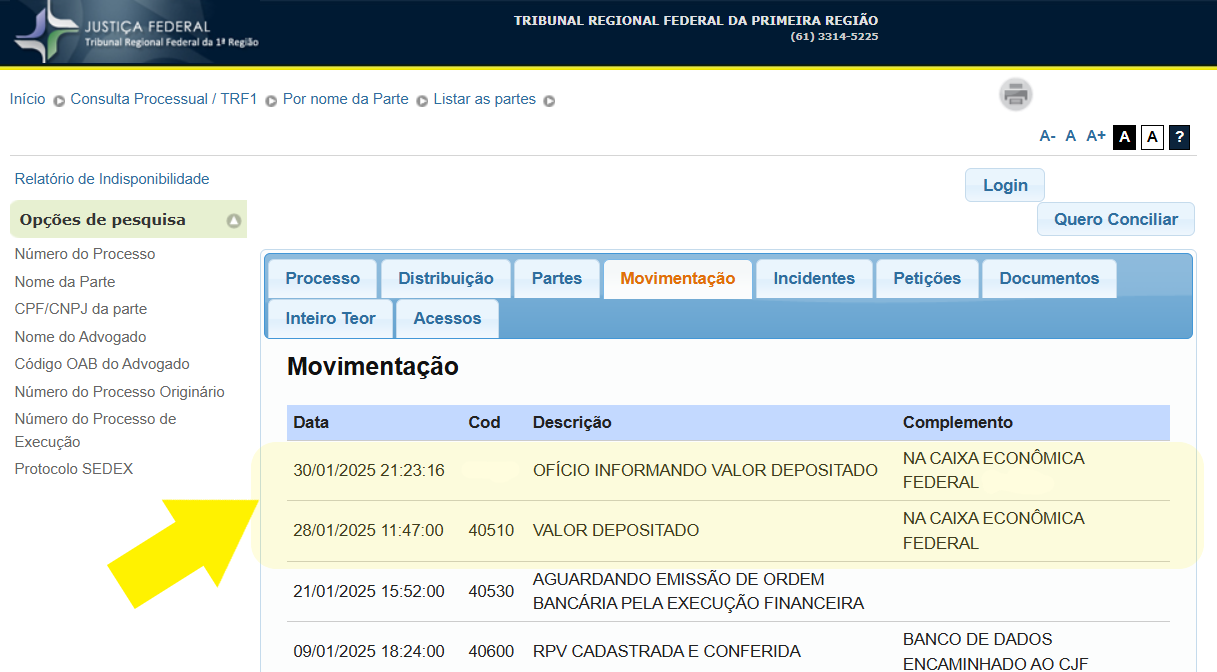 ...clicando no link “partes” aparecerá o nome da parte beneficiada e, clicando em “movimentação” a informação se o valor já está depositado e em que instituição
