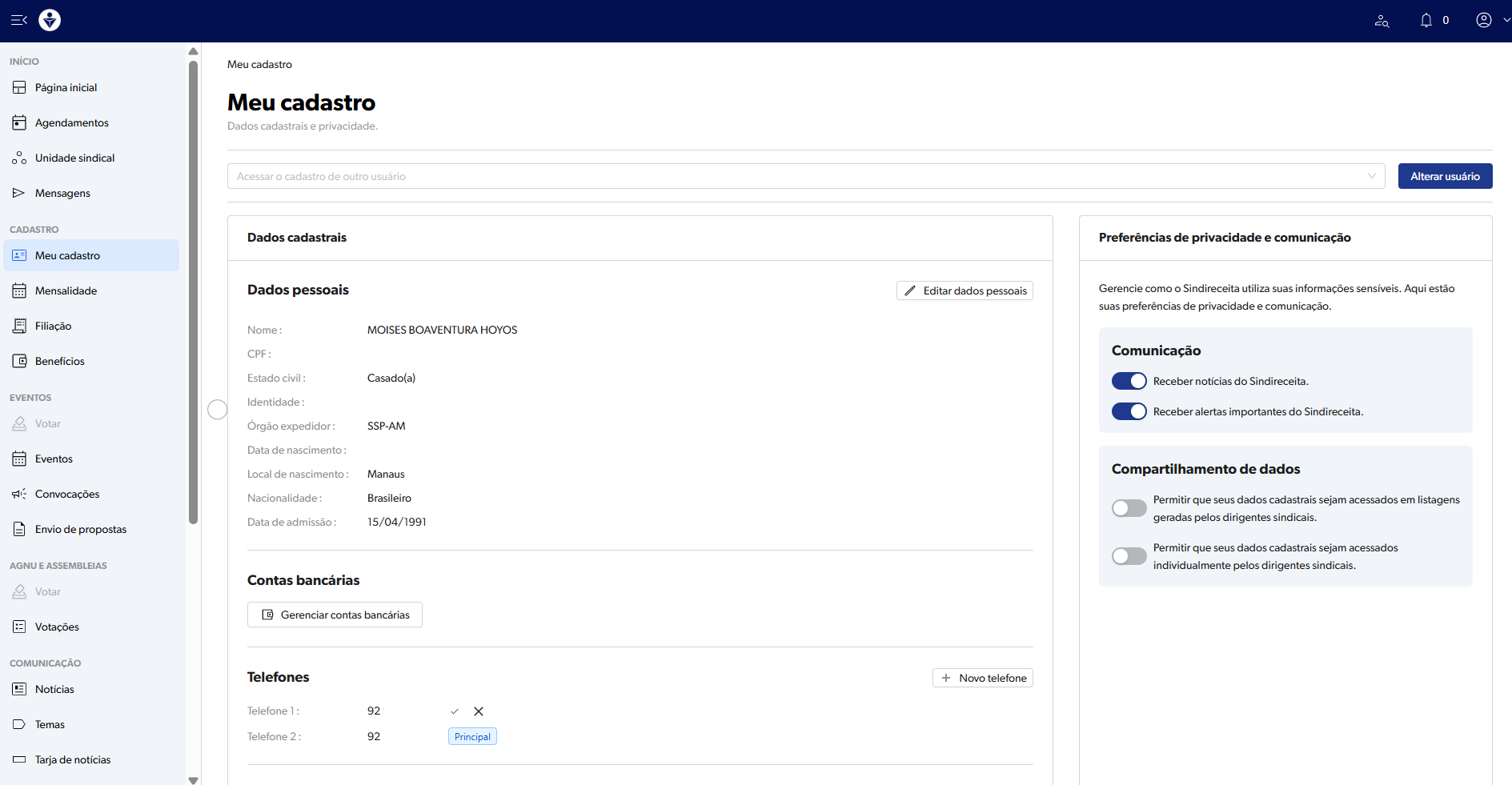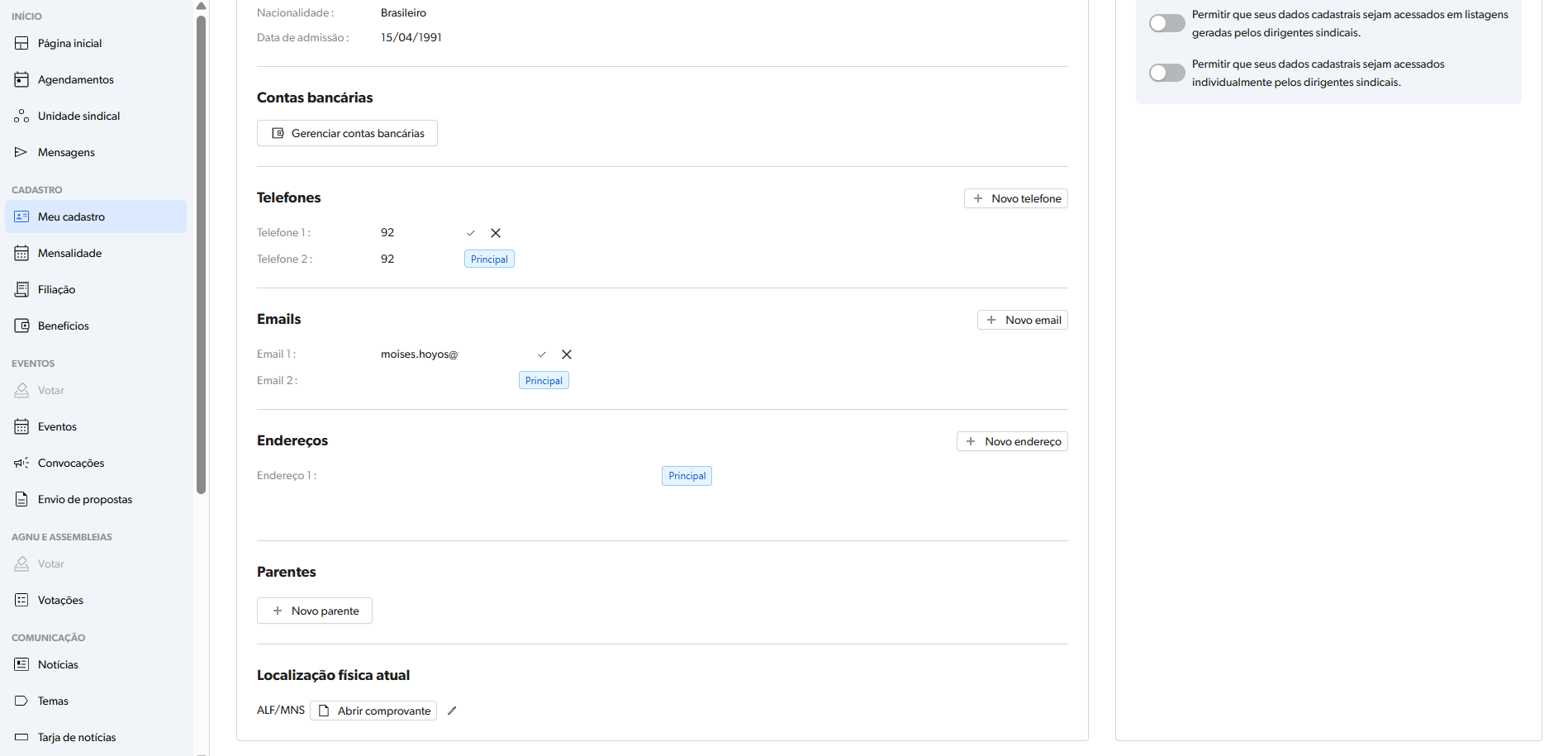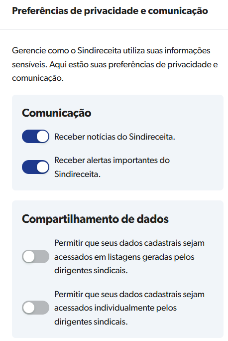 Ainda no campo MEU CADASTRO o filiado ou filiada poderá indicar algumas "Preferências de privacidade e comunicação", bastando acionar ou não o "botão":