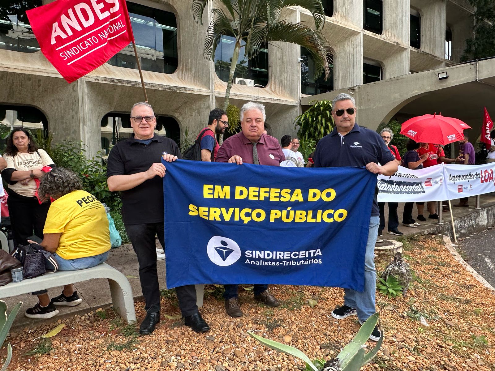 Durante a reunião, Analistas-Tributários e Analistas-Tributárias da Receita Federal do Brasil (RFB), representados pelos diretores Fabiano Rebelo (Estudos Técnicos); Sérgio de Castro (Assuntos Parlamentares) e Breno Rocha também participaram de ato público unificado do funcionalismo federal, que ocorreu em frente ao Anexo do Bloco F, na Esplanada dos Ministérios, Brasília/DF.
