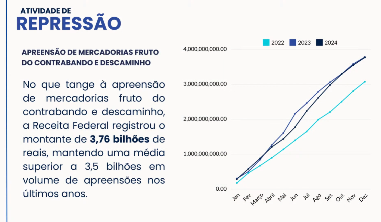 Para termos a dimensão desse trabalho realizado, no ano de 2024 as atividades de combate ao contrabando e descaminho resultaram, de acordo com a Receita Federal, em apreensões que totalizaram R$ 3,76 bilhões em mercadorias.
