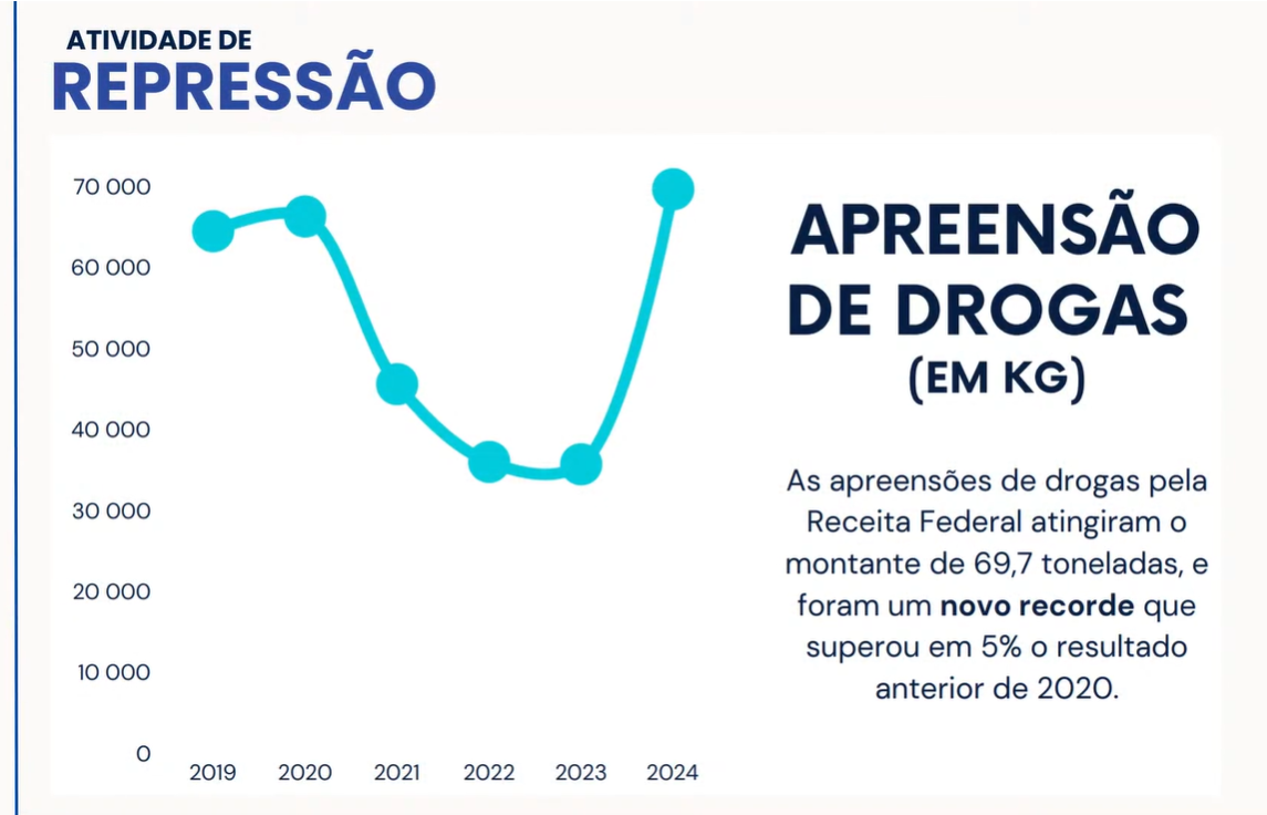 No campo de combate ao tráfico de drogas o resultado em 2024 foi de 69,7 toneladas de drogas apreendidas.