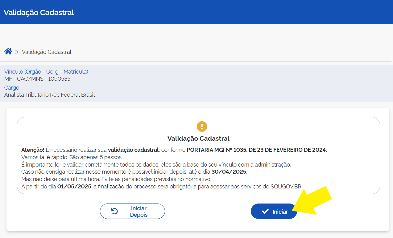Todos os agentes públicos ativos, aposentados, pensionistas, anistiados e servidores líderes de equipe deverão validar seus dados cadastrais a partir de 1º de março. Nesta data, tem início o Ciclo 2025 da Validação Cadastral Obrigatória, que será realizada exclusivamente pela plataforma SOUGOV.BR, conforme determina a Portaria MGI nº 1.035, de 23 de fevereiro de 2024. O prazo para o procedimento vai até 30 de abril.