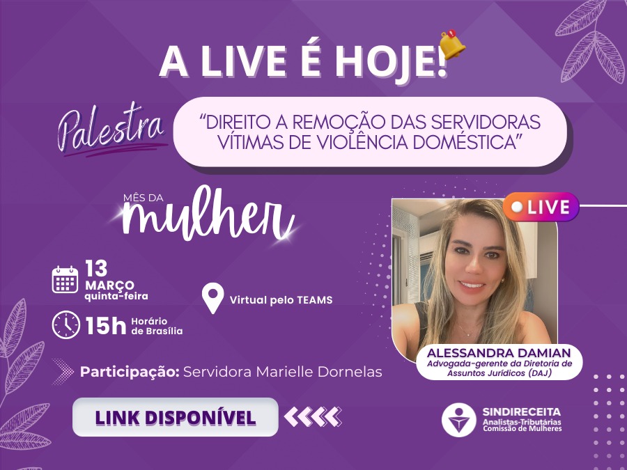 A transmissão ao vivo integra a programação do Sindicato em homenagem ao Dia Internacional da Mulher, celebrado em 8 de março, e terá participações da advogada gerente nacional da DAJ, Dra. Alessandra Damian Cavalcanti e da servidora da Receita Federal do Brasil (RFB), Marielle Dornelas. A coordenadora-geral da Comissão de Mulheres do Sindireceita, Denise Rodrigues de Figueredo, mediará os debates no decorrer da Live.