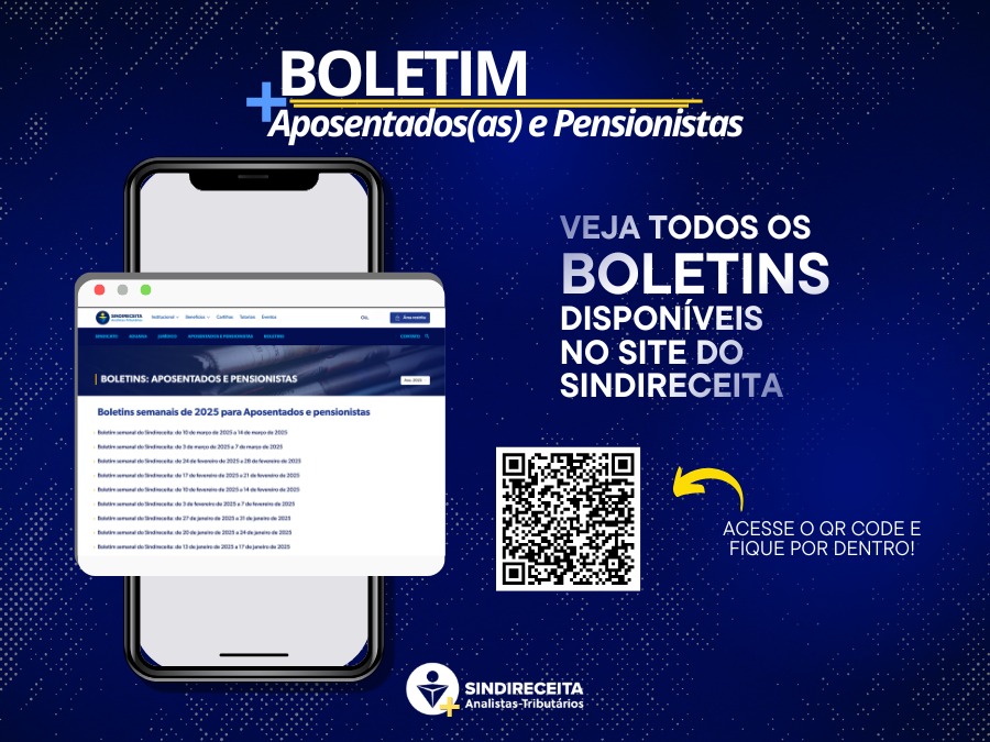 Com a divulgação periódica do Boletim Semanal para Aposentados e Pensionistas, a Diretoria reforça o seu compromisso de manter a nossa base em todo o Brasil sempre bem informada sobre o trabalho conduzido pelo Sindicato em defesa dos direitos de todos os nossos filiados e filiadas. A publicação dos Boletins e demais iniciativas de comunicação realizadas pelo Sindireceita também têm por objetivo garantir transparência sobre as todas as ações conduzidas pela Diretoria Executiva Nacional em prol da nossa categoria.