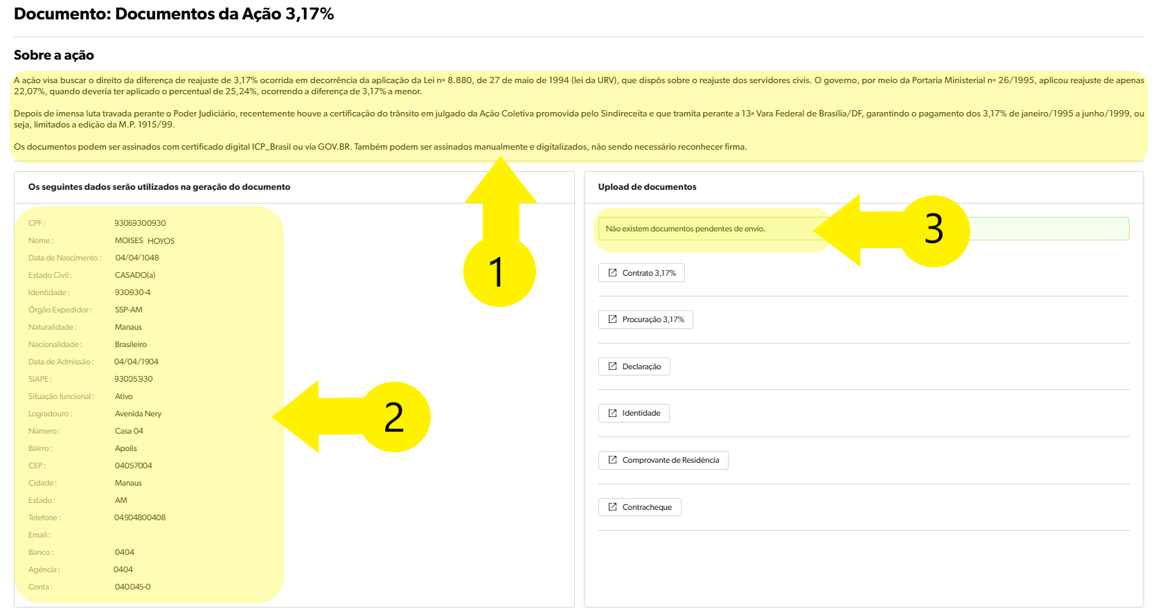 Clicando nos documentos, de acordo com a ação de interesse, o filiado ou filiada acessará informações como: Dados pessoais que irão constar nos documentos disponibilizados para envio ao jurídico do sindicato ou ao escritório contrato pelo sindicato para “tomar conta” daquela ação; documentos a serem assinados e enviados; acompanhamento do andamento dos documentos enviados; e últimas movimentações da ação.