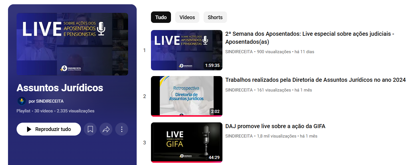A playlist reúne diversos conteúdos produzidos pela Diretoria de Assuntos Jurídicos (DAJ), como Lives, webinários e palestras sobre as principais ações judiciais de interesse da categoria, como as ações da GIFA, da CPSS sobre Férias, dos 28,86% de Fortaleza e Brasília, dos 3,17%, da RAV 8X, da ação da paridade, entre outras.