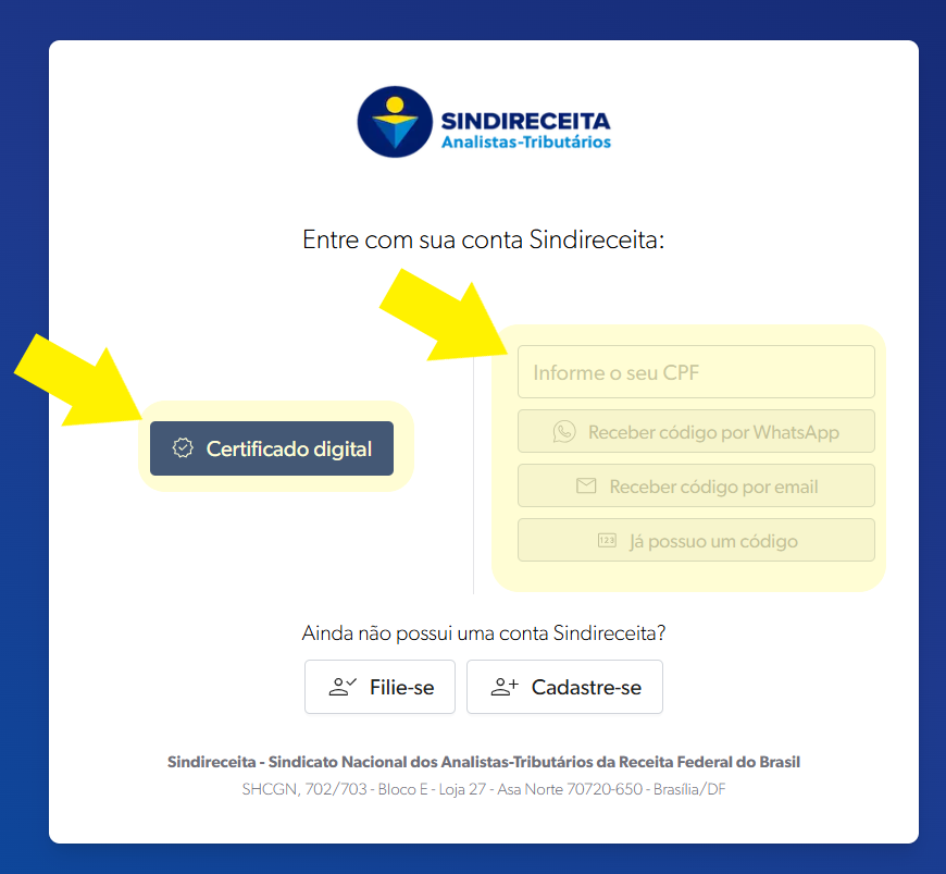 Para entrar na Área restrita o filiado ou filiada precisa informar o CPF e solicitar o código de acesso, que pode ser enviado pelo Whatapp, e-mail ou SMS. Para quem usa o Certificado Digital o mesmo poderá ser usado para acessar a Área restrita.
