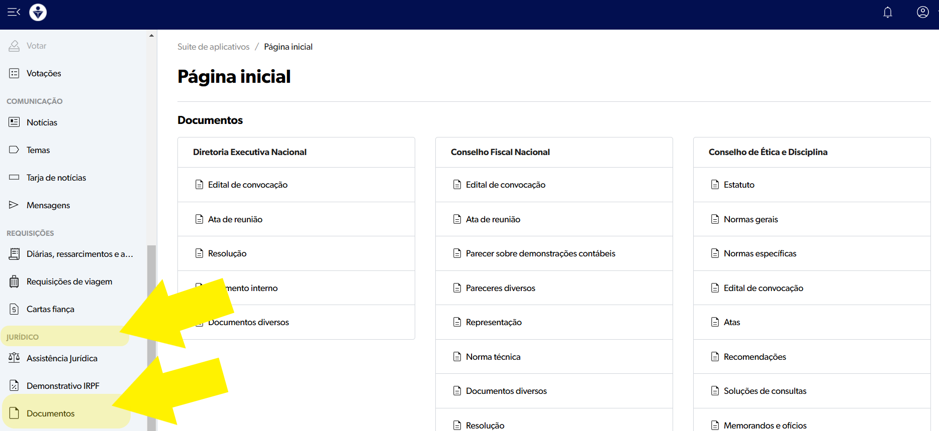 No menu localizado no lado esquerdo da tela desça até a opção JURÍDICO/DOCUMENTOS .