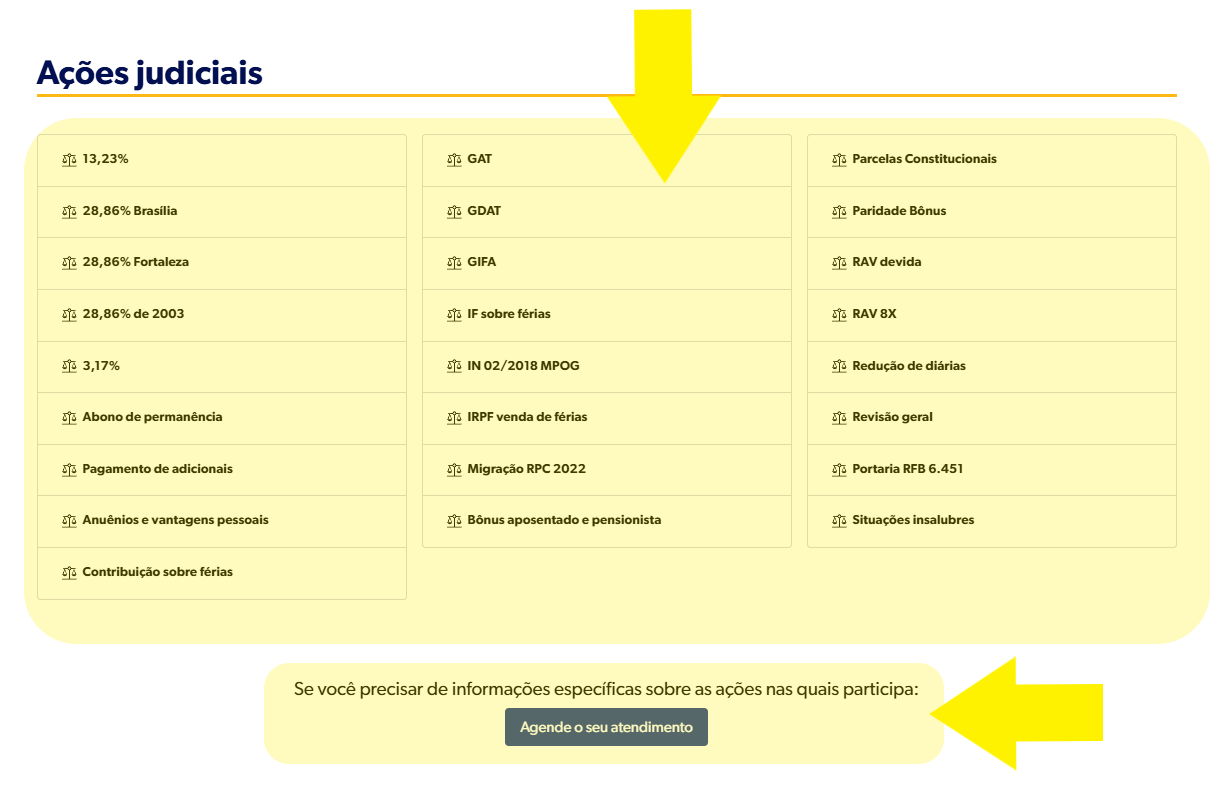 Ao clicar no botão VER TODAS AS AÇÕES todas as ações judiciais do sindicato estarão elencadas em várias colunas. Ao final da página o botão AGENDAMENTO está disponibilizado para que o filiado ou filiada, caso tenham dúvidas, possam agendar um atendimento virtual com os advogados do sindicato. Veja o PASSO A PASSO DO AGENDAMENTO AQUI .