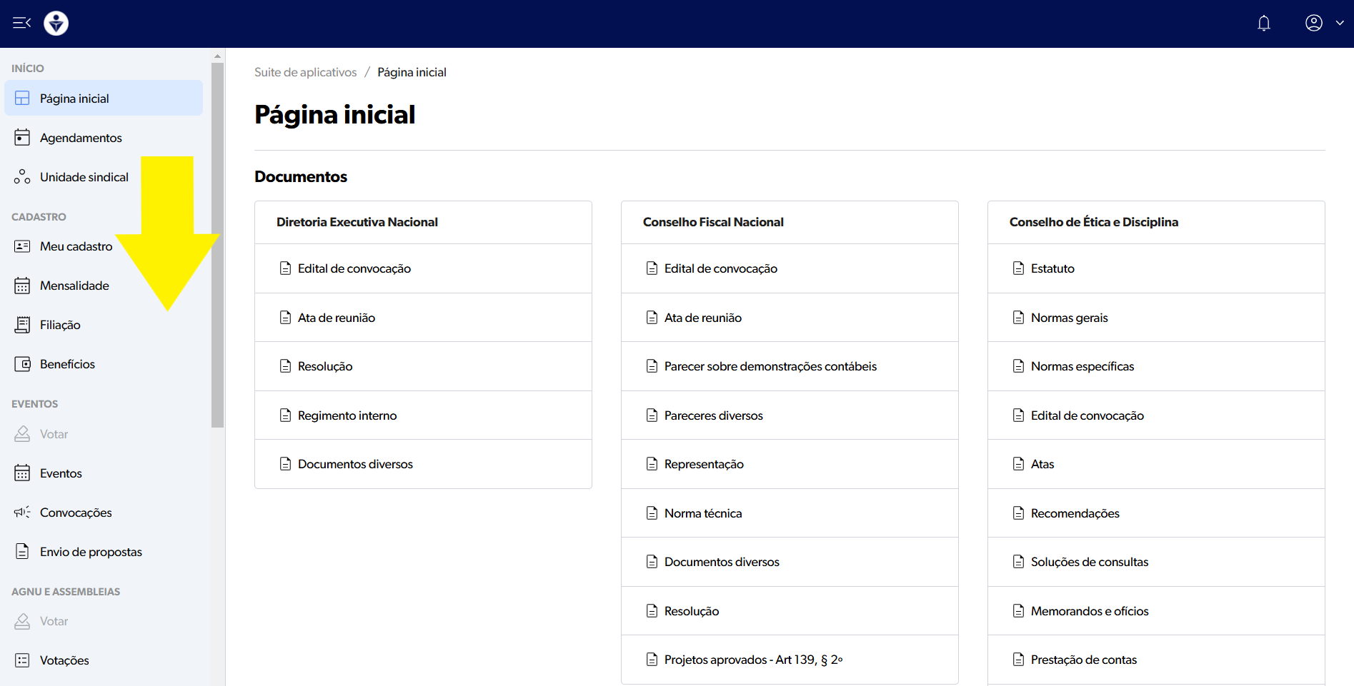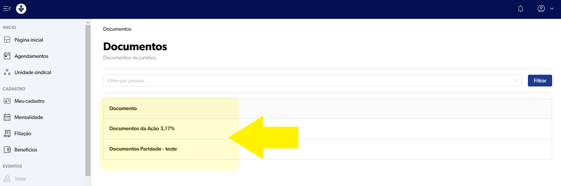 Ao entrar na página DOCUMENTOS o filiado ou filiado terá acesso às ações que estão sendo tratadas na nova Área restrita .